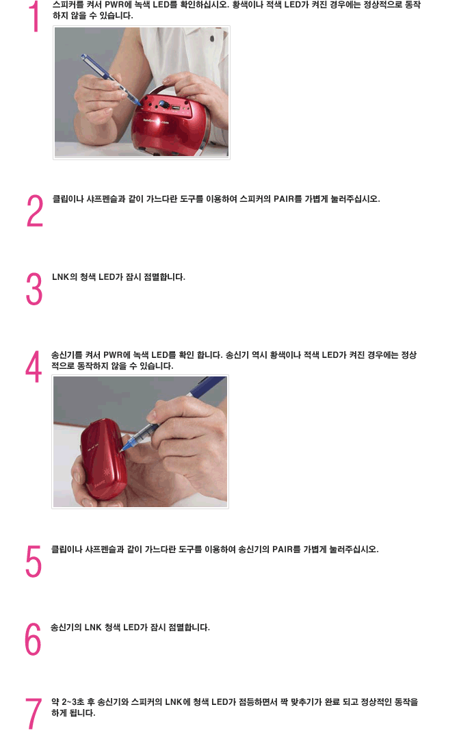 송신기와 스피커 둘 중 하나를 새 제품으로 교체한 경우 사용하기 전에 짝을 맞춰 주어야 합니다.